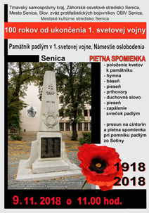 V piatok 9. novembra 2018 sa pri Pamätníku obetí prvej svetovej vojny na Námestí oslobodenia v Senici konala spomienková slávnosť Deň červených makov, spojená s pietnym aktom kladenia vencov pri príležitosti Dňa vojnových veteránov, ktorého symbolom sa stal červený vlčí mak. Pietnu spomienku organizačne zabezpečili Trnavský samosprávny kraj, Záhorské osvetové stredisko Senica, Mesto Senica, Slovenský zväz protifašistických bojovníkov Oblastný výbor SenicaMestské kultúrne stredisko Senica pri príležitosti 100. výročia skončenia prvej svetovej vojny.