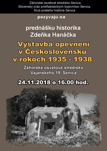 Záhorské osvetové stredisko Senica, Slovenský zväz protifašistických bojovníkov Senica a Klub priateľov histórie Senica vás srdečne pozývajú v sobotu 24. novembra 2018 o 16:00 hodine do Záhorského osvetového strediska v Senici na prednášku historika Zdeňka Hanáčka s názvom „Výstavba opevnení v Československu v rokoch 1935 – 1938“.